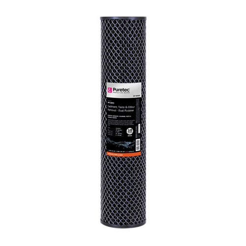 Dual Purpose Carbon Cartridges are a pleated cartridge with carbon impregnated within it. They offer sediment-filtration, as well as taste, odour and chlorine taste, and odour reduction in one cartridge.